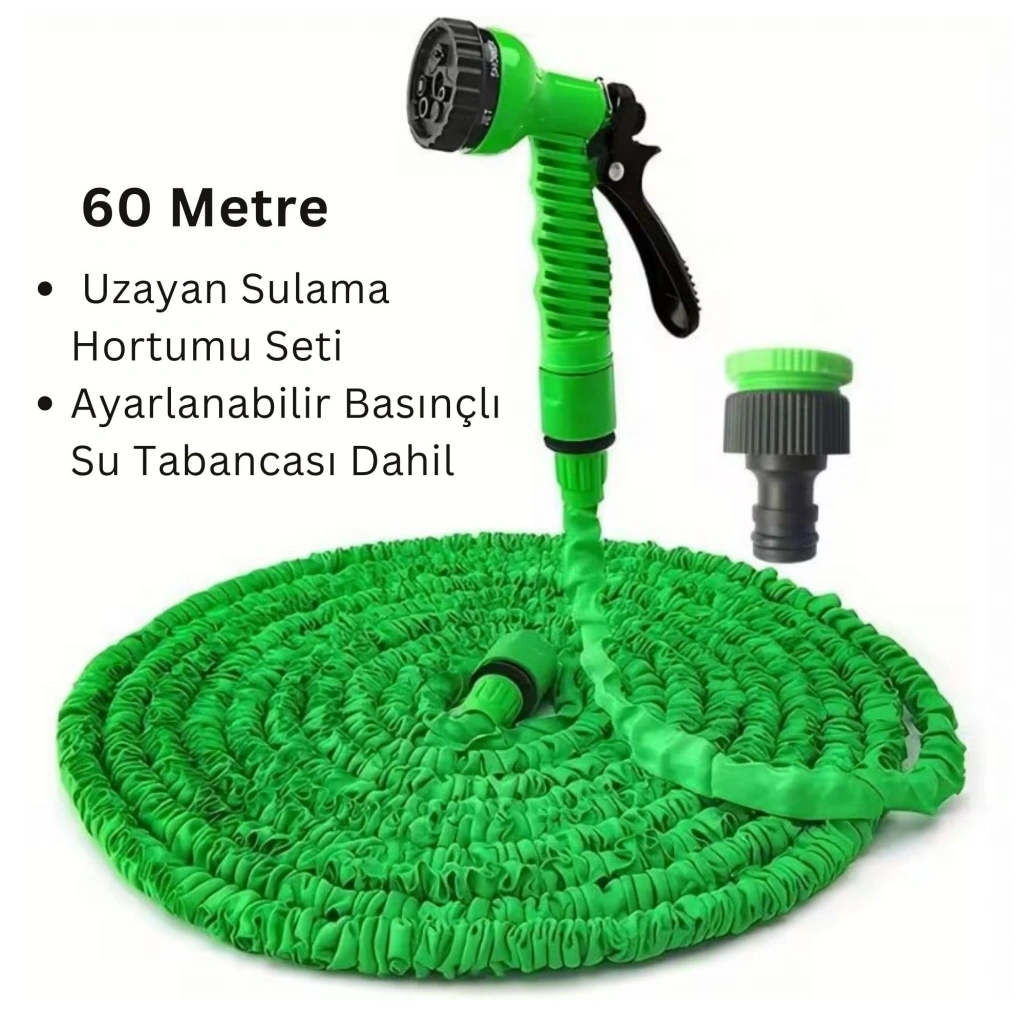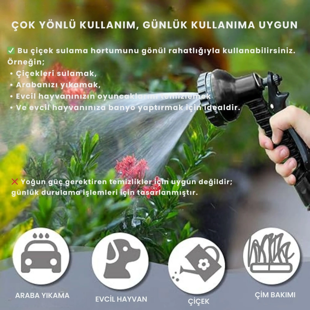 ETASHOP 60 Metre Uzayan Bahçe Sulama Hortumu Seti 7 Fonksiyonlu Ayarlanabilir Su Tabancalı Sızdırmaz Esnek Hortum ETASHOP uzayan bahçe hortumu, su verildiğinde kendi uzunluğunun 3 katına kadar uzayan hafif ve esnek yapısıyla dar alanlarda bile konforlu kullanım sağlar. Yüksek kaliteli TPE iç hortum ve dayanıklı polyester dış kılıf, kırılma ve bükülmeye karşı güçlendirilmiş 3 katmanlı yapı sunar; böylece geleneksel hortumlara göre çok daha uzun ömürlü ve sızdırmaz bir çözüm elde edersiniz. 7 fonksiyonlu ayarlanabilir su tabancası; çiçek ve çim sulamadan araba, bisiklet, cam ve veranda temizliğine kadar farklı ihtiyaçlara uygun jet, sis, duş ve düz akış gibi modlar sağlar. 1/2" ve 3/4" erkek dişli musluklarla uyumlu adaptörü sayesinde bahçe musluğuna saniyeler içinde bağlanır, işiniz bittiğinde ise kompakt hale küçülüp dolapta, balkonda ya da garajda minimum yer kaplar. • 60 METRE UZAYAN HORTUM: Su akışı başladığında uzunluğunu yaklaşık 3 kata kadar artırarak geniş bahçe, avlu ve araç çevresine rahatça ulaşmanızı sağlar.