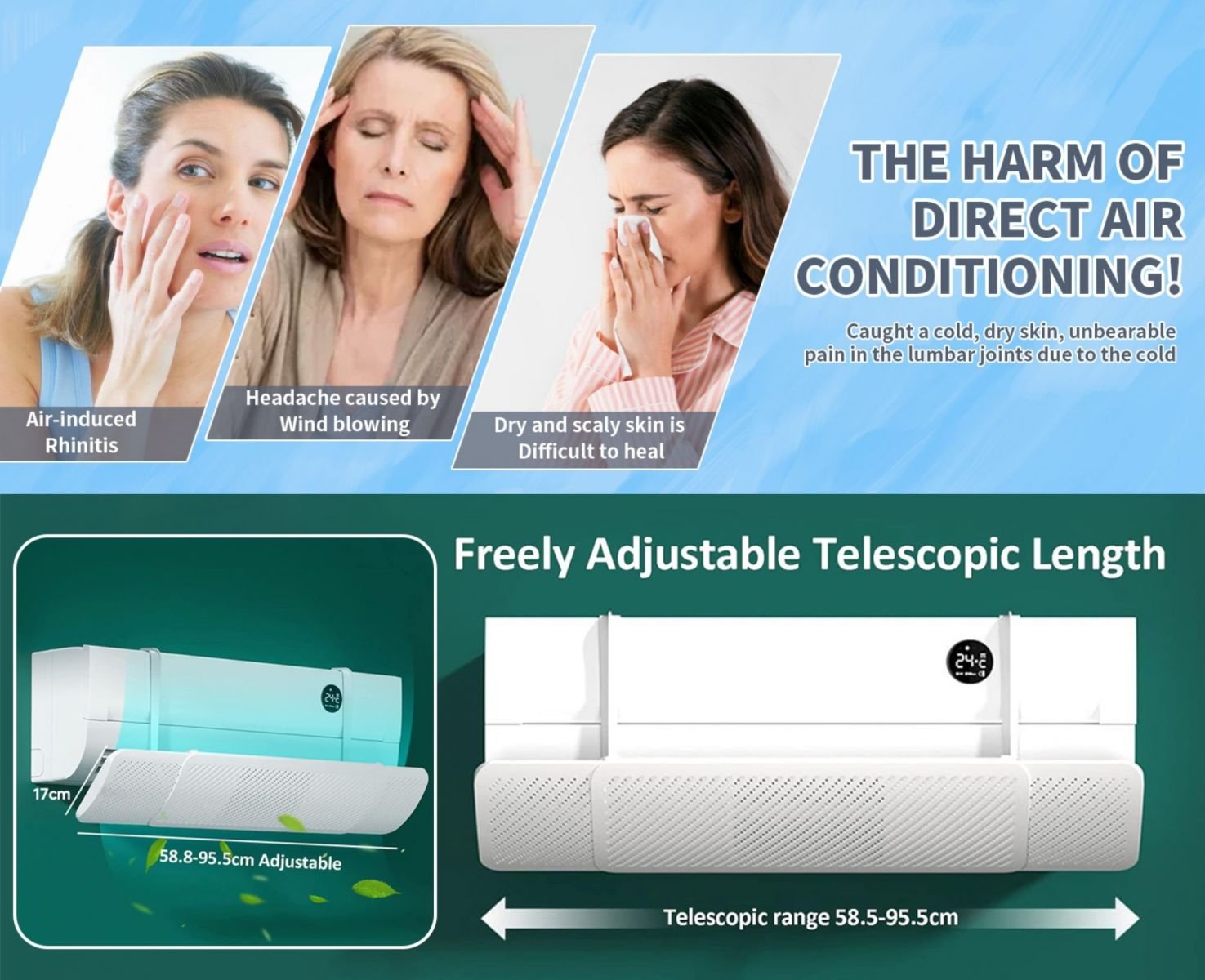 • UNİVERSAL & AYARLANABİLİR UZUNLUK: Teleskopik gövde 58–92 cm aralığında uzayıp kısalabilir; 60–90 cm hava çıkış genişliğine sahip neredeyse tüm split klima modelleriyle uyumludur.