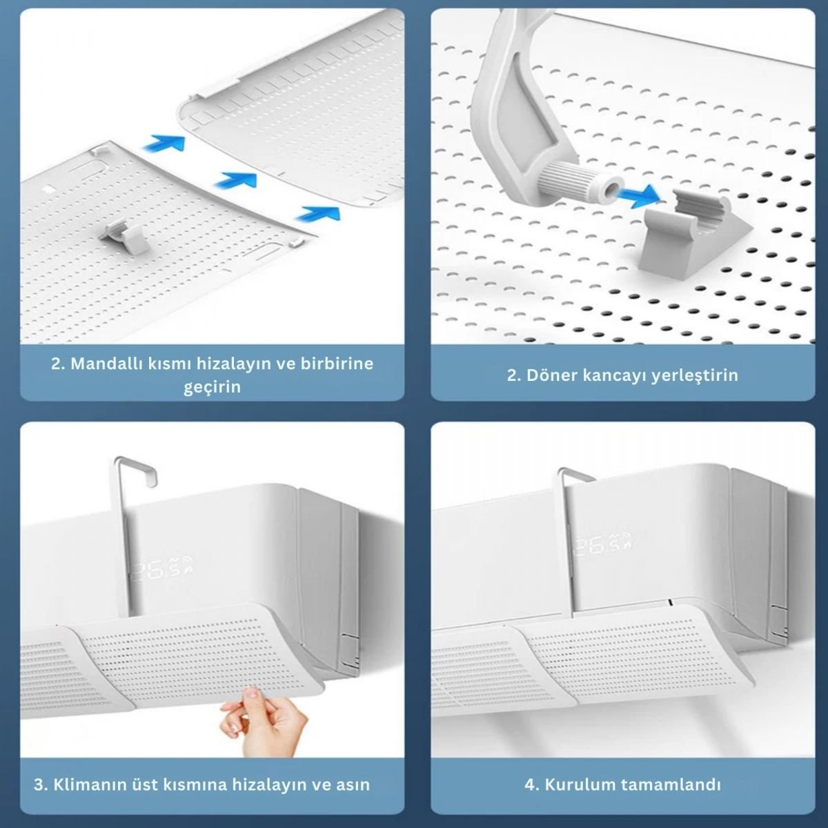 • ALET GEREKTİRMEYEN KOLAY MONTAJ: Esnek askı kayışlarıyla klimaya yukarıdan geçirilerek monte edilir; duvar delme, vida, matkap gerektirmez. İstenildiğinde iz bırakmadan sökülüp başka odaya taşınabilir.