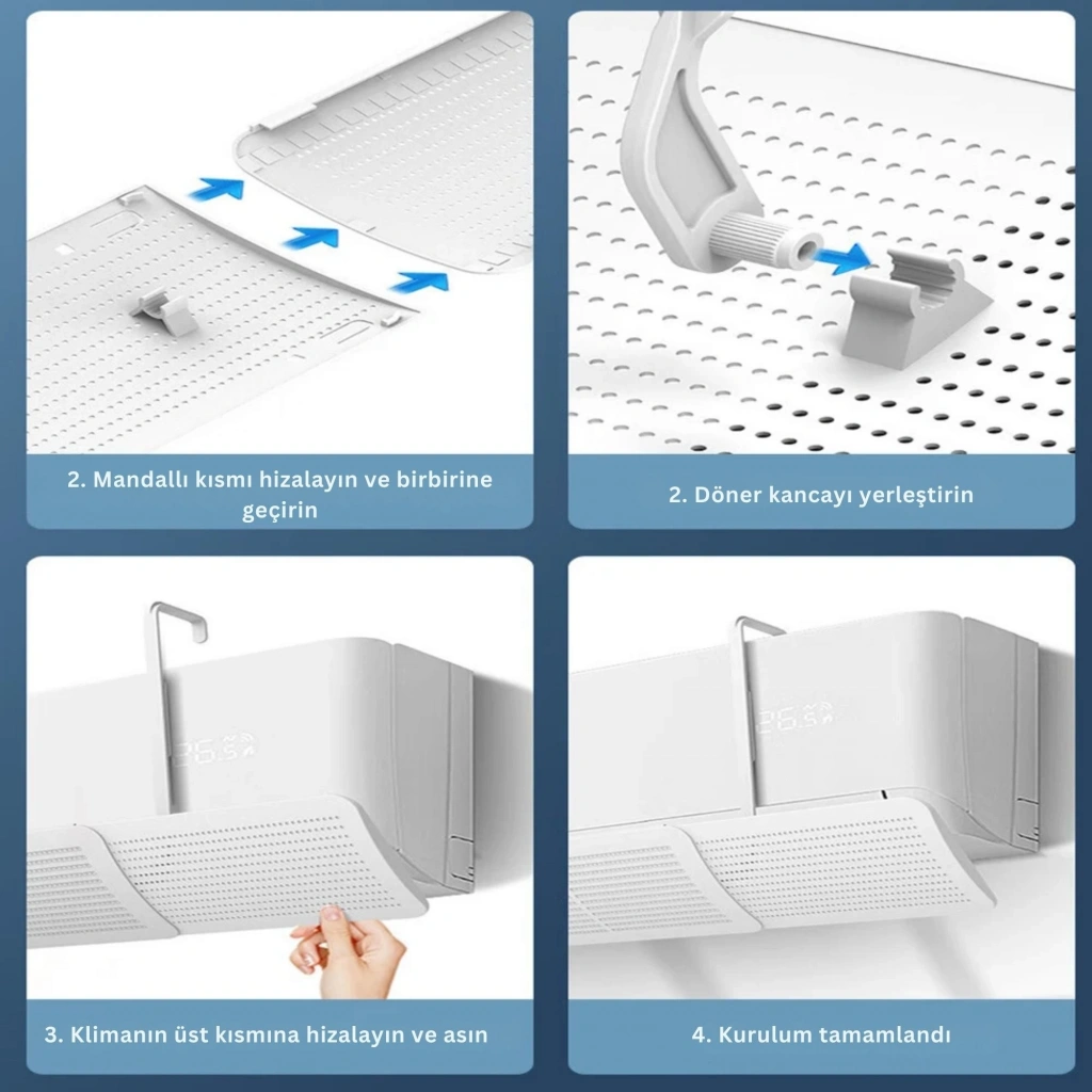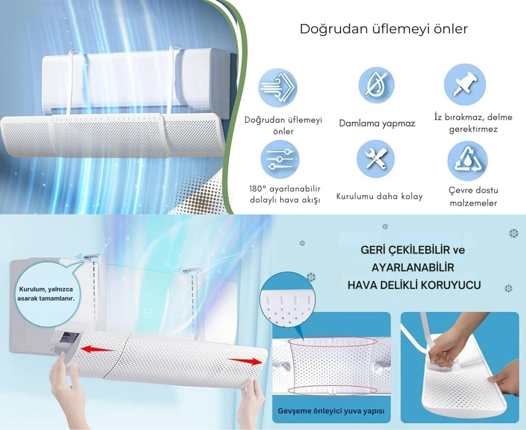 ETASHOP Ayarlanabilir Delikli Klima Hava Yönlendirici Universal Split Klima Rüzgar Perdesi, Klima Çarpması Önleyici 60 90 cm ETASHOP ayarlanabilir klima hava yönlendirici, split klimanın soğuk ya da sıcak havasını doğrudan üzerinize üflemek yerine yumuşak ve dengeli şekilde aşağıya/ileri yönlendirir. Teleskopik yapısı sayesinde 60–90 cm arası çoğu duvar tipi klima ile uyumludur; 3000+ hava deliğiyle havayı homojen dağıtır, yoğuşma ve damlama yapmaz. Alet gerektirmeyen askılı montajı sayesinde duvarı delmeden dakikalar içinde kurulur; bebek odası, yatak odası, ofis ve oturma odalarında klima çarpmasına karşı ekstra konfor ve koruma sağlar. Yazın soğuk, kışın sıcak havayı yönlendirerek dört mevsim sağlıklı iklimlendirme sunar. • KLİMA ÇARPMASINI ÖNLER: Soğuk ya da sıcak havayı doğrudan insan üzerine üflemeyi engeller; boyun tutulması, baş ağrısı, göz kuruluğu gibi klima kaynaklı rahatsızlıkların önüne geçmeye yardımcı olur.