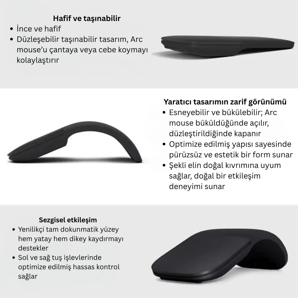 ETASHOP Katlanabilir Kablosuz 2.4G Arc Mouse Sessiz Dokunmatik 1000 DPI Taşınabilir Ergonomik Fare ETASHOP katlanabilir kablosuz arc mouse, hem Bluetooth hem 2.4G USB alıcı ile dizüstü bilgisayar, PC ve tabletlerinize saniyeler içinde bağlanır. İnce ve kavisli gövdesi, kullanmak istediğinizde hafifçe bükülerek açılır; işiniz bittiğinde düzleştirip kapatmanız yeterlidir. Böylece açma/kapama düğmesi aramaz, pil tasarrufu sağlayarak çantanıza veya cebinize kolayca atabilirsiniz. Sessiz tıklama yapısı ve tam dokunmatik kaydırma yüzeyi sayesinde ofiste, evde, kütüphanede veya gece geç saatlerde kimseyi rahatsız etmeden çalışabilirsiniz. 1000 DPI hassas optik sensör, günlük ofis işlerinden tasarım ve sunumlara kadar tüm hareketlerinize akıcı tepki verir; ergonomik kıvrımı elinizin doğal formunu takip ederek uzun kullanımlarda bile konfor sunar. • KATLANABİLİR ARC TASARIM: Düzleştirildiğinde kapanan, büküldüğünde açılan yenilikçi gövde sayesinde hem taşıması hem saklaması son derece pratik; sırt çantasında, laptop çantasında minimum yer kaplar.